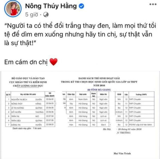 Cùng với đó, Nông Thúy Hằng cũng gửi lời cảm ơn đến những người tin tưởng mình. Người đẹp viết: "Người ta có thể đổi trắng thay đen, làm mọi thứ tồi tệ để dìm em xuống nhưng hãy tin chị, sự thật vẫn là sự thật. Em cảm ơn chị". Đây cũng chính là bằng chứng rõ nhất cho thấy Nông Thúy Hằng là mỹ nhân sở hữu học thức khá ấn tượng, không như lời đồn.