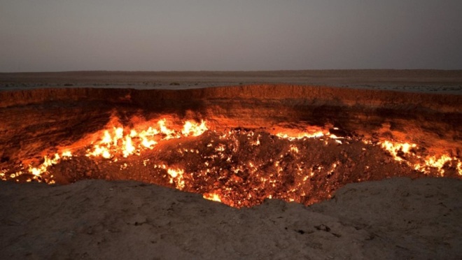 "Cổng địa ngục" là một hố lửa đỏ rực giữa sa mạc, cháy không ngừng suốt hơn 50 năm qua và có thể nhìn thấy khi cách xa vài km. Chiếc "cổng địa ngục" này vô tình được tạo ra trong thời kỳ Chiến tranh Lạnh, khi các nhà địa chất đào xuống để tìm dầu mỏ mà không biết bên dưới lớp đất mỏng là một túi khí tự nhiên khổng lồ. Khi bắt đầu đào, lớp đất vỡ ra và tạo thành một hố khổng lồ, đồng thời thải ra khí mêtan.