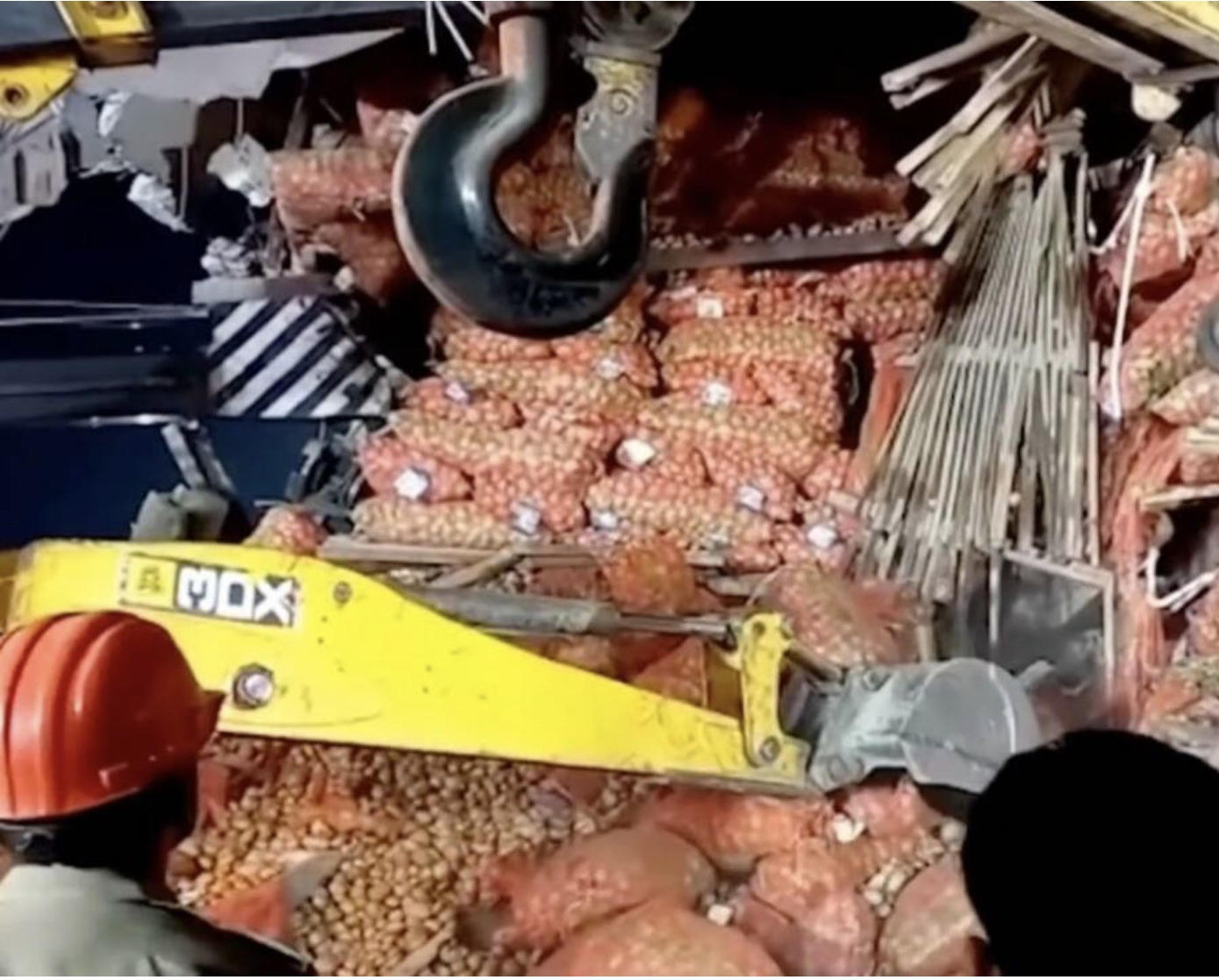 Trang tin Metro đưa tin, hình ảnh từ hiện trường cho thấy lực lượng cứu hộ sục sạo trong núi khoai tây và gạch vỡ để tìm những người sống sót. Vụ việc xảy ra vào sáng 16/3 khi hàng chục lao động đang có mặt trong kho.