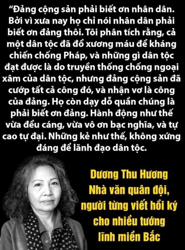 Nhắc đến Dương Thu Hương, người viết chợt nhớ đến lời nhận xét của một dịch giả nổi tiếng trong nước, khi gặp ông tại Lausanne, Thuỵ Sĩ: “Văn chương của Dương Thu Hương không có gì đặc biệt và khó đọc”. Khi ấy người viết có nói rằng “khó đọc” có lẽ vì nó trần trụi và khốc liệt khi phơi bày những sự thật, những nỗi thống khổ của người dân Việt Nam trong cái nhà tù khổng lồ lộ thiên! Văn chương của bà là thứ văn chương phản kháng mà không phải ai cũng có cái dũng và sự can đảm để viết…