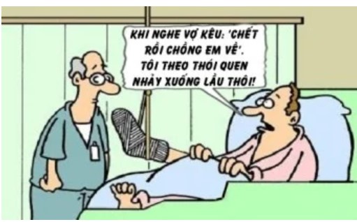 - Sao tự dưng anh lại nhảy từ trên lầu xuống để gãy chân thế này?