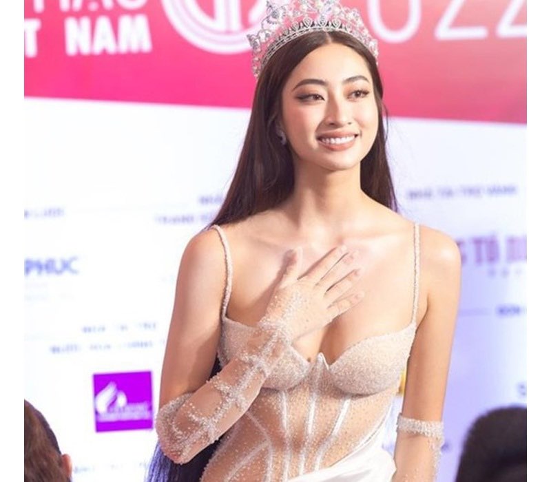 Đây không phải là lần đầu tiên Lương Thùy Linh diện kiểu đầm này. Cô cũng từng mặc chiếc váy xuyên thấu kiểu dáng tương tự nhưng có phần táo bạo hơn nhờ lớp vải sheer mỏng manh, đính kết đá lấp lánh quanh thân trên làm điểm nhấn.