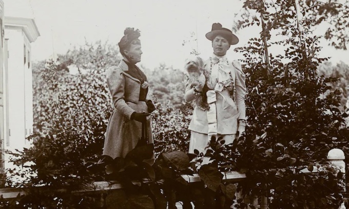 Bức ảnh duy nhất được biết đến chụp Rose Cleveland (trái) và Evangeline Simpson Whipple tại khu vườn trong nhà riêng của Evangeline ở Wayland, Massachusetts. Ảnh: Massachusetts Historical Society