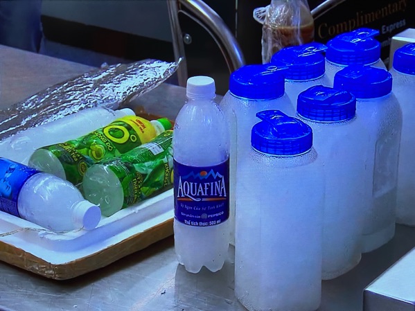 Khám hành lý, phát hiện một hộp bột trắng. Hải quan tiếp tục khám thì phát hiện rất nhiều chai nước, không những thế còn ướp đá lạnh trong thùng carton xốp.