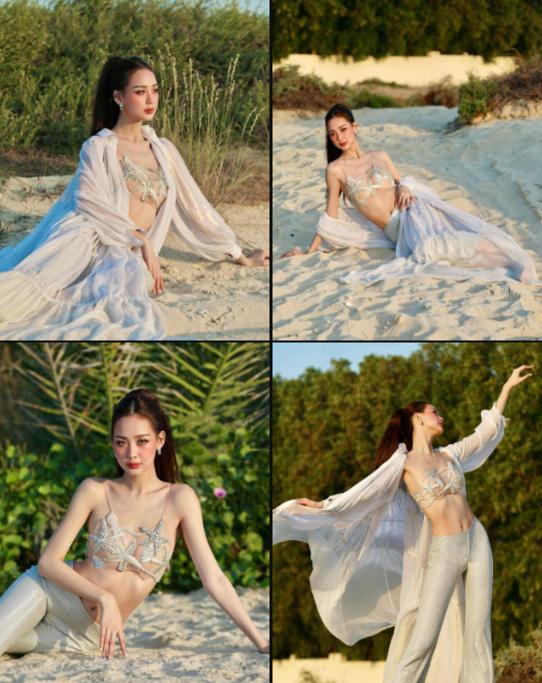 Mới đây, Bảo Ngọc khoe dáng trên biển với trang phục bao gồm áo bơi xuyên thấu, đính kèm họa tiết sao biển phối cùng quần ống loe và áo kimono màu trắng.