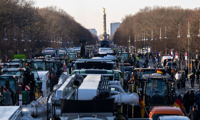 Nông dân bắt đầu tập trung tại Cổng Brandenberg ở trung tâm Berlin từ tối 7/1. Hàng chục máy kéo và xe tải sau đó xuất hiện trên những tuyến phố lân cận, tài xế liên tục bấm còi nhằm bày tỏ phản đối chính phủ. "Chúng tôi phải làm việc 365 ngày mỗi năm, nhưng không kiếm đủ tiền từ sản phẩm của mình", Jenny Zerbin, nông dân 34 tuổi tham gia biểu tình, cho hay.