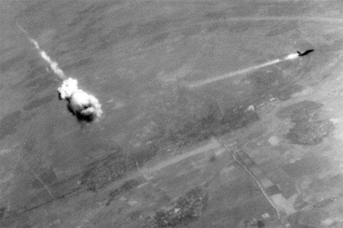 Khoảng khắc chiếc tiêm kích F-105 bị bắn hạ bởi tên lửa đất đối không SA-2. Có thể thấy máy bay đang bốc cháy ở bên phải hình ảnh. (Ảnh: Wikimedia Commons).