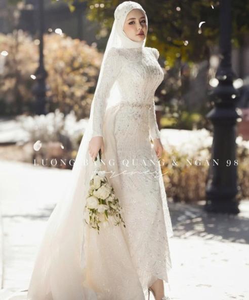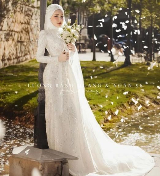 Điểm nhấn trong bức ảnh mới của Ngân 98 đó là khăn trùm kín phần tóc trông vô cùng lạ mắt. Được biết bộ ảnh cưới mới toanh này được cặp đôi chụp trong tháng 8.
