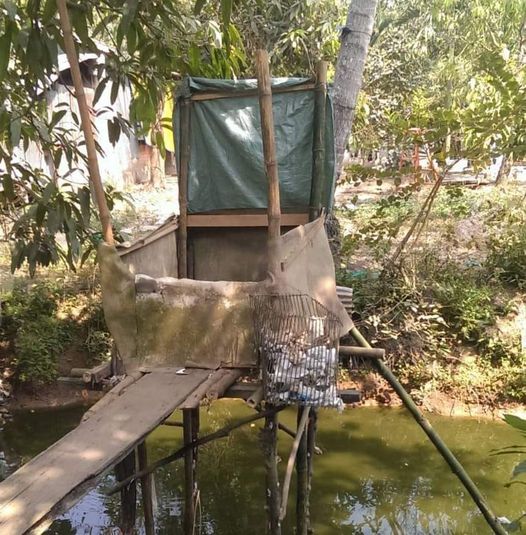 Để đi ra nhà phải đi ngang một cây cầu ngăn ngắn. Chính giữa ngôi nhà nhỏ là hai thanh gỗ nằm song song vừa đủ đặt bàn chân mỗi bên, vào thế ngồi chổm hổm khi cần rất ư thoải mái. Chỉ tội là mảnh gỗ che phía trước rất thấp, nên ai cao thì hai đầu gồi nhô hẳn lên trên, thành ra thấy ba cái đầu khi ngồi