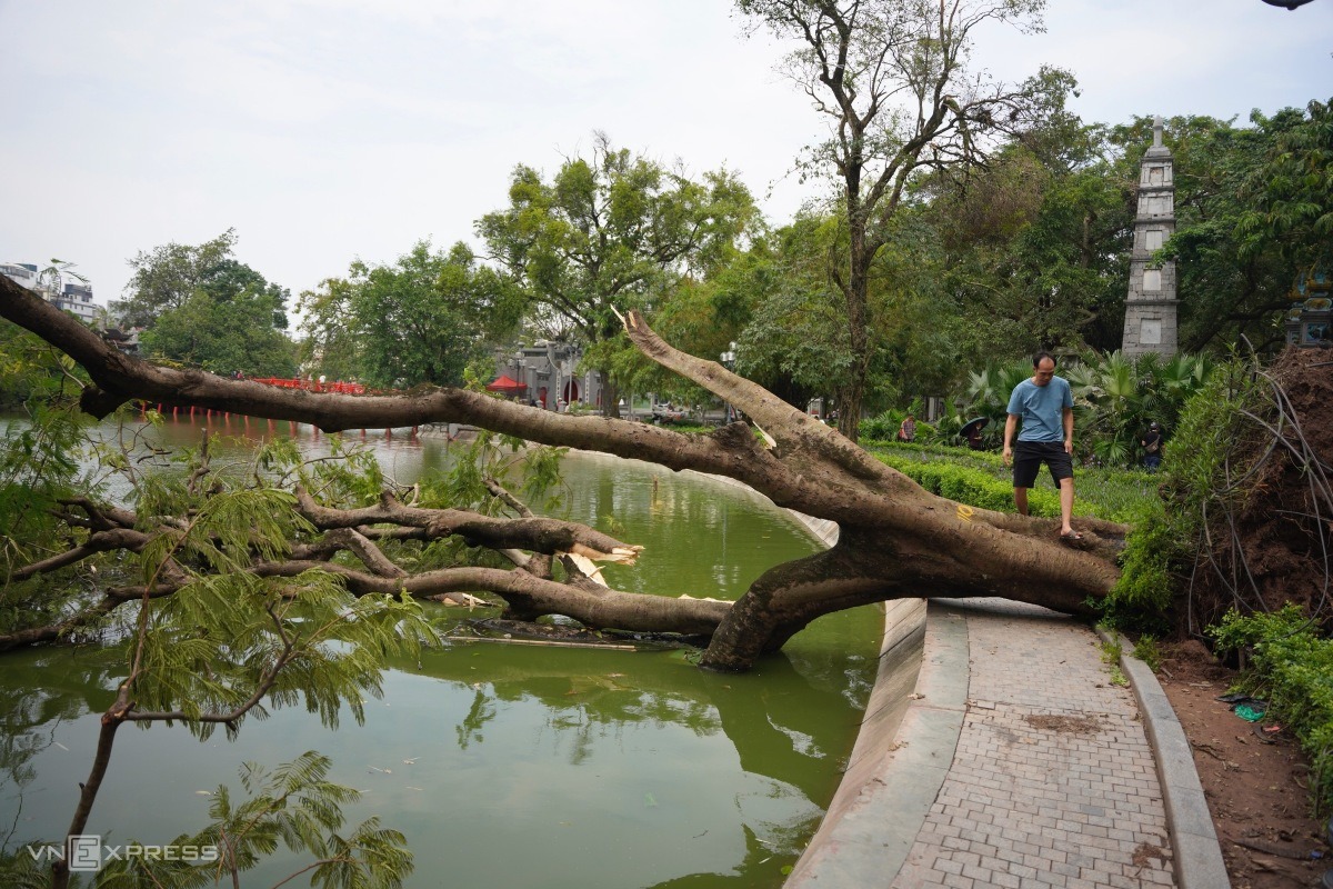 By Friday, reports indicated over 40,000 fallen trees, with eight districts including Phu Xuyen, My Duc, and Long Bien yet to fully account for the damage. One of the most significant impacts is around Hoan Kiem Lake, a major tourist attraction, where a large flamboyant tree has blocked the pedestrian walkway, leaving the lakeside road inaccessible. Similarly, two ancient trees in front of St. Joseph's Cathedral on Nha Tho Street remain uprooted, although authorities have trimmed the branches and moved them to the sidewalk.