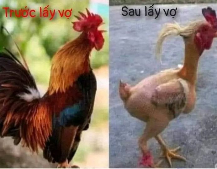 Nhìn con gà trống sau khi lấy vợ thì trọc lông nhưng vẩn còn lỏm chỏm nhưng không ai biết con gà mái sau khi lấy chồng là vầy nè.