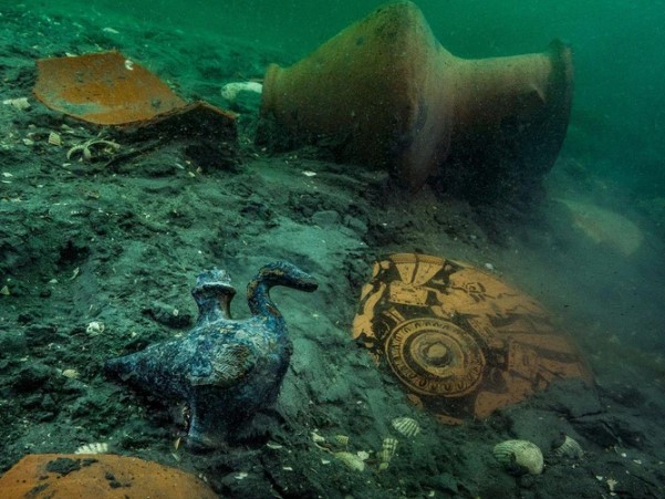 Một chiếc bình hình con vịt bằng đồng nằm giữa những đồ vật bằng gốm tại nơi thờ thần Aphrodite của người Hy Lạp ở tàn tích của Tp.Thonis-Heracleion. Ảnh: Hilti Foundation