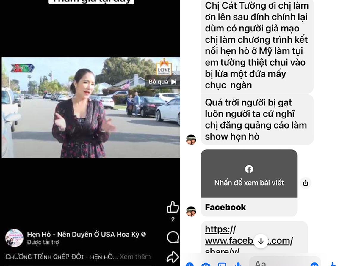 Theo lời cô Cát Tường, trang Facebook "Hẹn Hò-Nên Duyên ở USA Hoa Kỳ" chạy quảng cáo trên mạng xã hội để thu hút nhiều con mồi.