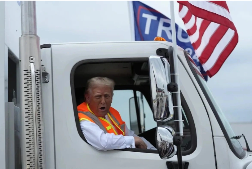"Bạn thấy xe chở rác của tôi thế nào? Xe tải này để vinh danh bà Kamala Harris và ông Joe Biden", cựu Tổng thống nói khi ngồi ở ghế phụ của xe tải chở rác có dán khẩu hiệu và cờ tranh cử của ông.