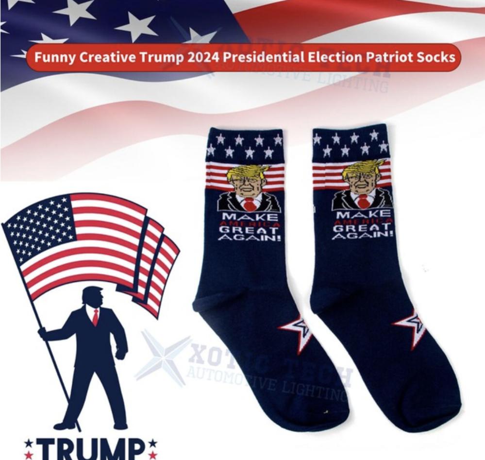 Tất chân in hình ứng viên Donald Trump và khẩu hiệu nổi tiếng của ông. Ảnh: eBay.