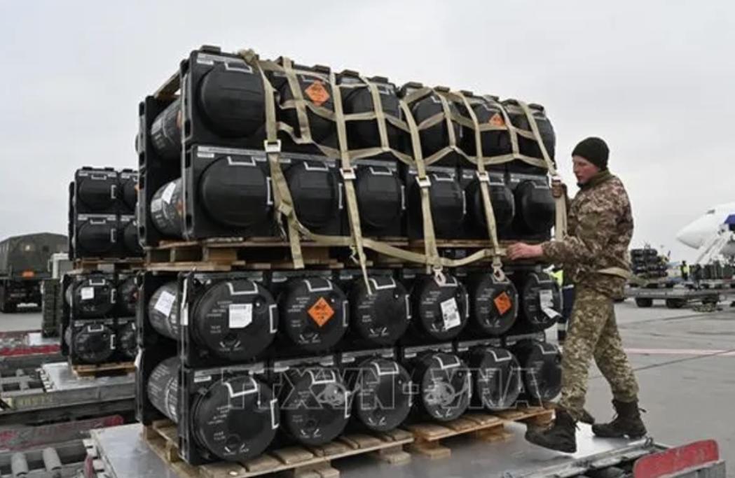 Lô tên lửa Javelins do Mỹ viện trợ được chuyển tới sân bay ở Kiev, Ukraine ngày 11/2/2022. Ảnh: AFP/TTXVN