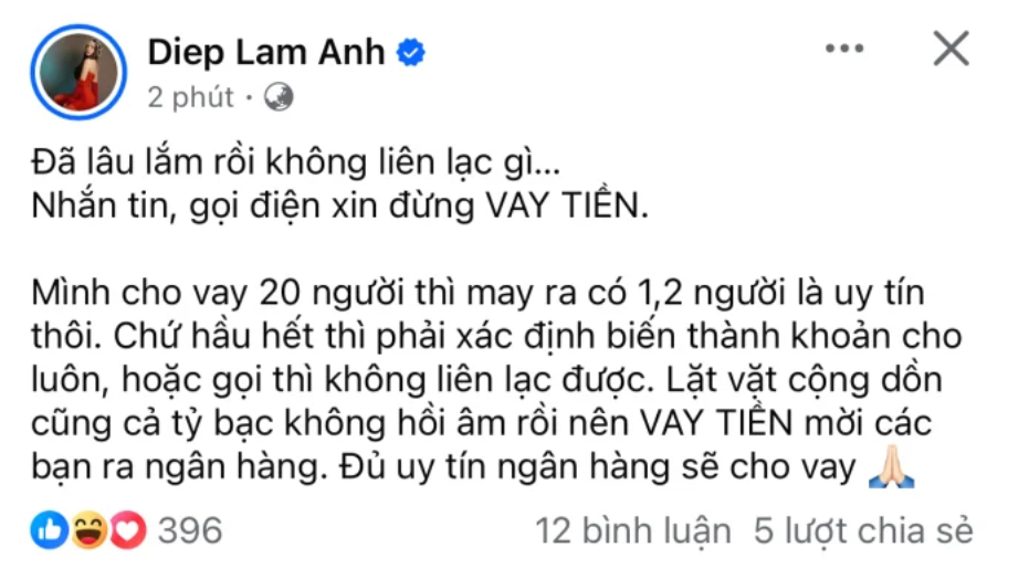 Diệp Lâm Anh kể: "Đã lâu lắm rồi không liên lạc gì, nhắn tin, gọi điện xin đừng vay tiền. Mình cho vay 20 người thì may ra có 1,2 người là uy tín thôi. Chứ hầu hết thì phải xác định biến thành khoản cho luôn, hoặc gọi thì không liên lạc được. Lặt vặt cộng dồn cũng cả tỷ bạc không hồi âm rồi nên vay tiền mời các bạn ra ngân hàng. Đủ uy tín ngân hàng sẽ cho vay".