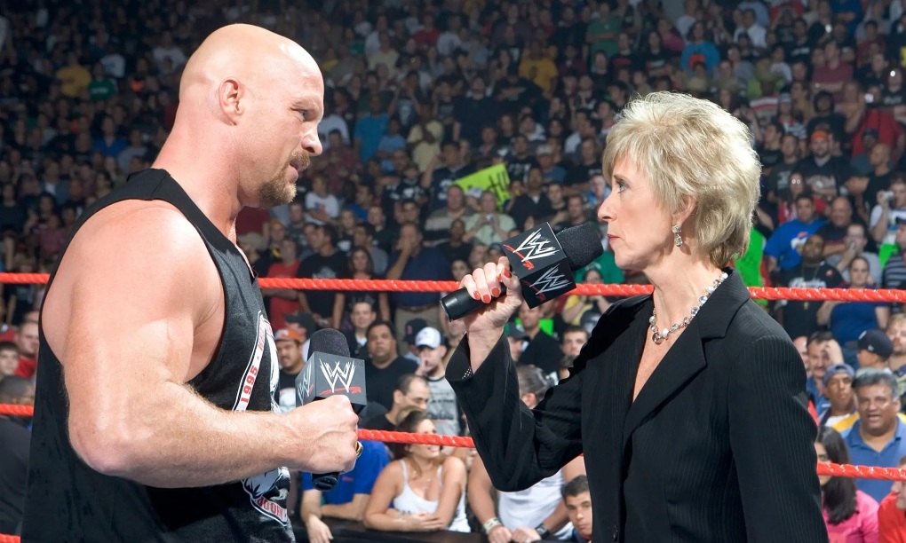 Linda McMahon trên võ đài của WWE vào năm 2005, diễn màn đấu khẩu với đô vật Steve Austin. Ảnh: WWE