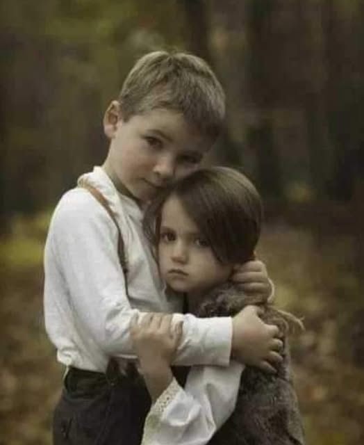 Cậu bé nhìn chị chăm chú, vuốt tóc cô bé và ôm chặt hơn.