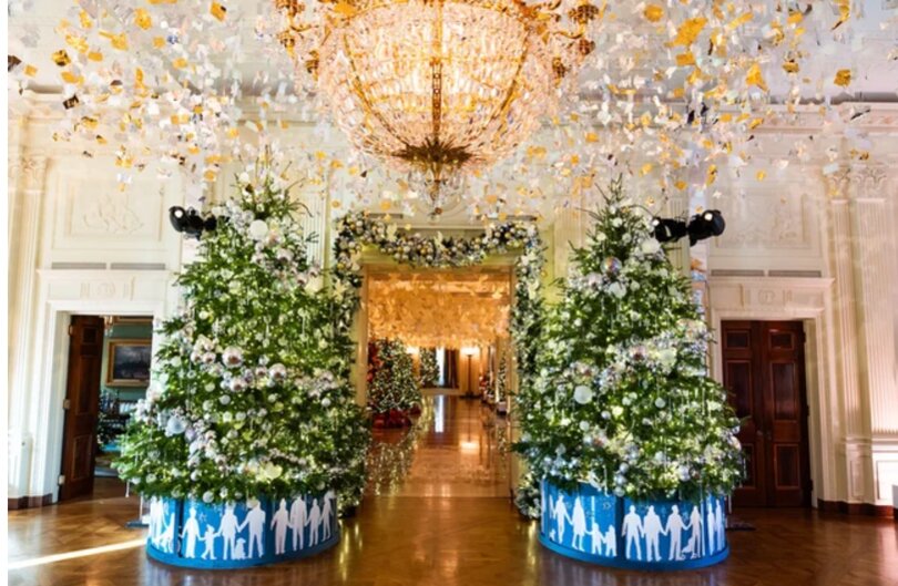 Theo CNN, Nhà Trắng vừa được trang hoàng để đón Giáng sinh. Chủ đề trang trí năm nay là “mùa hòa bình và ánh sáng”, lấy cảm hứng từ tinh thần của mùa lễ hội. Cuối tuần qua, 300 tình nguyện viên và nhân viên phục vụ treo hàng nghìn bóng đèn nhấp nháy và chim bồ câu giấy bay lơ lửng.