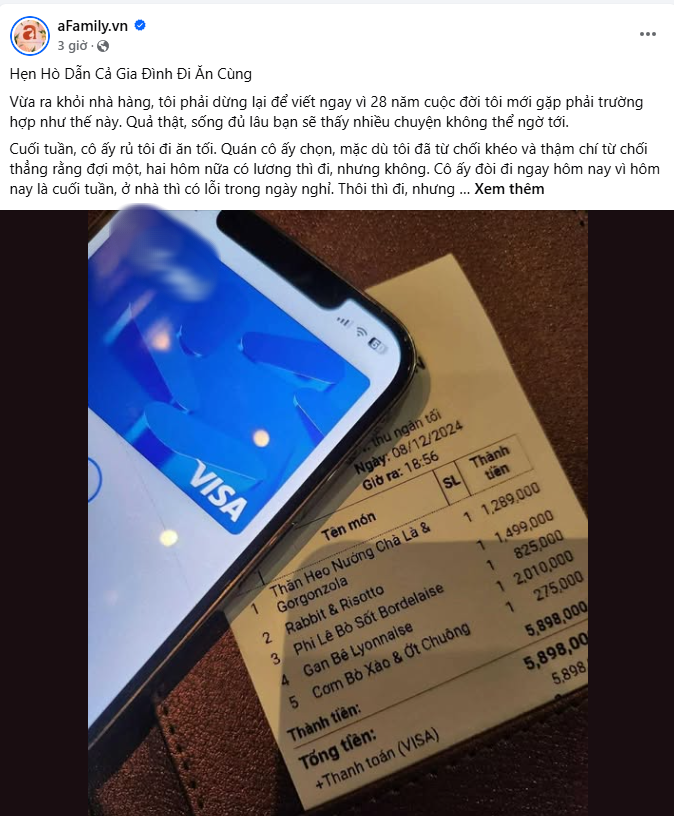 Tôi đứng hình vì tôi cũng muốn gặp phụ huynh của cô ấy nhưng không phải như thế này và vào lúc này. Nghĩ vậy nhưng không biết phải từ chối hay nói như nào cho phải, thế là người nhà của cô ấy cũng đến. Với số lượng đồ ăn cho hai người chắc chắn không đủ rồi, theo phép lịch sự, tôi cũng ngỏ lời mọi người ăn gì gọi thêm. Kết quả là hóa đơn của tôi từ hơn 2 triệu lên gần 6 triệu luôn.