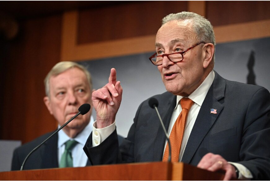 Lănh đạo phe đa số tại Thượng viện Mỹ Chuck Schumer vui mừng báo tin dự luật ngân sách tạm thời mới đă được cơ quan này thông qua - Ảnh: AFP