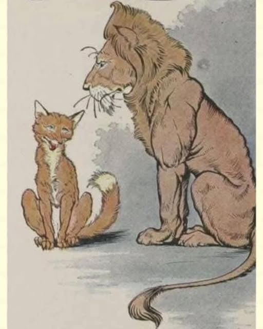 Một hôm, Sư Tử cảm thấy đói bụng và nói với Cáo: