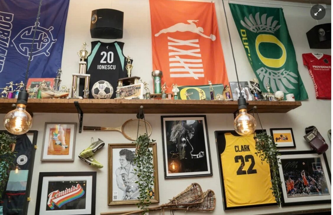 Bức tường đầy những hiện vật liên quan đến thể thao nữ ở The Sports Bra.