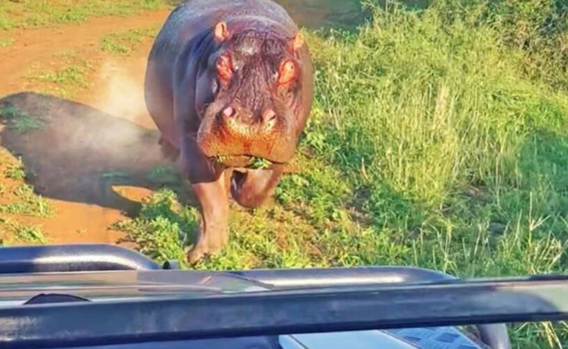 Với bản tính hung dữ và bảo vệ lãnh thổ vốn có, chú hà mã liền lao tới tấn công những khách đi săn. Rất may cho họ là nhờ vào tốc độ của chiếc ô tô nên cả 3 người đã may mắn thoát khỏi cuộc tấn công của con hà mã này.
