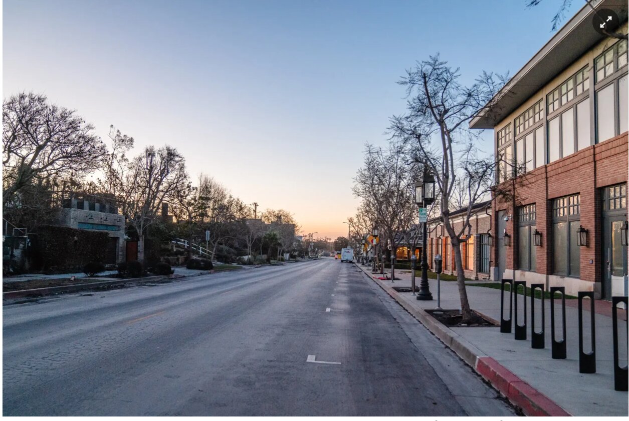 Một bên là những lô đất từng là những ngôi nhà trị giá hàng triệu USD giờ chỉ còn tro tàn và gạch vụn. Bên kia là trung tâm mua sắm ngoài trời có hàng loạt tên tuổi như Chanel, Buck Mason và một nhà hàng sushi cao cấp, phần lớn còn nguyên vẹn.