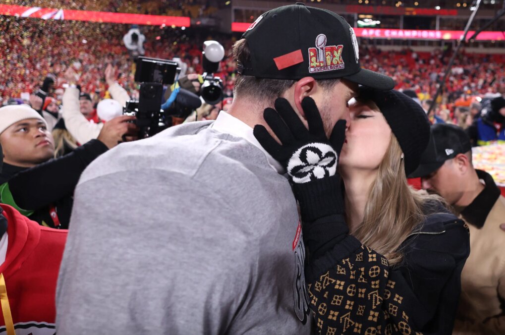 Theo Page Six tối 26/1 (giờ Missouri, Mỹ), Taylor Swift đi cùng mẹ cô và mẹ bạn trai. Họ theo dõi trận đấu trong một phòng VIP của sân vận động Arrowhead. Kết thúc trận, ca sĩ xuống sân ôm chầm Travis Kelce, tranh thủ trò chuyện với anh. Hai người thể hiện tình cảm trước người hâm mộ.