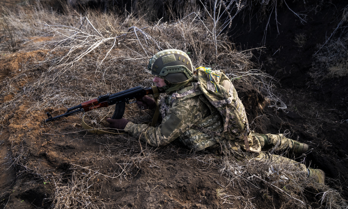 Tân binh của Tiểu đoàn Xung kích Alcatraz Ukraine tham gia huấn luyện tại tỉnh Donetsk hôm 31/1. Ảnh: AFP