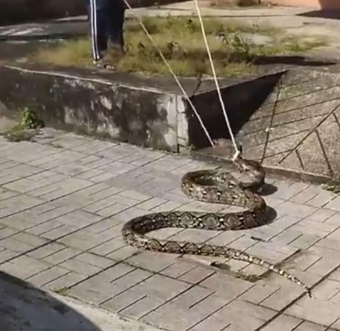 Sau đó, con rắn đã bị dụ ra khỏi xe và xuống vỉa hè, nơi tình nguyện viên cứu hộ động vật đã bắt nó lại bằng thòng lọng.