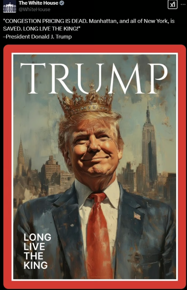 Ông Trump tuyên bố “Nhà vua muôn năm” để kết thúc một thông điệp trên mạng xã hội vào hôm thứ Tư trong tuần, nói rằng ông đã hủy bỏ kế hoạch của New York nhằm áp đặt mức phí tắc nghẽn cao nhất là 9 USD đối với ô tô đi vào phần lớn khu vực Manhattan đông đúc.