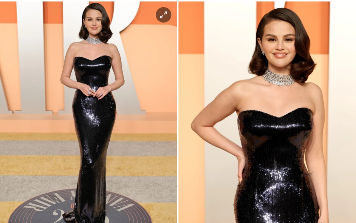 Selena Gomez tiếp tục ghi điểm với phong cách thời trang ấn tượng. Nữ tỷ phú khoe đường cong quyến rũ trong bộ đầm sequin cúp ngực, ôm sát theo mốt Old Hollywood Glamour, gợi nhớ đến những biểu tượng nhan sắc của Hollywood thập niên 1950. Lối trang điểm tối giản nhưng sắc sảo, với làn da căng bóng, son môi màu nude hồng gia tăng vẻ tinh tế.