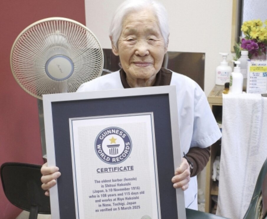 Shitsui Hakoishi, 108, poses for a photo with a Guinness World Records certificate recognizing her as the world's oldest female barber, at her shop in Nakagawa in Tochigi Prefecture, eastern Japan, March 5, 2025. Photo by AP