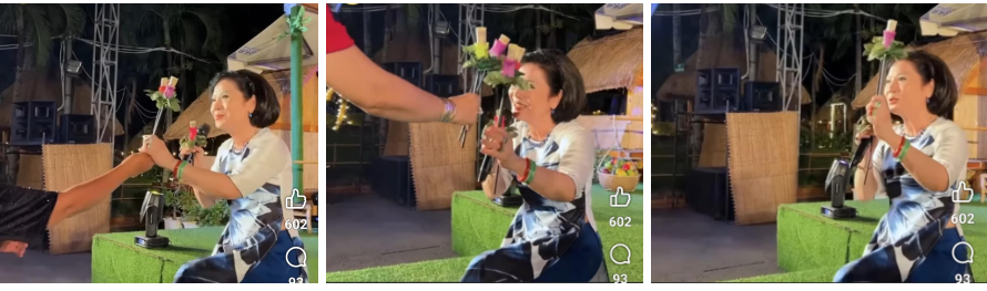 Khi được nhận hoa, nhiều lần nghệ Mộng Tuyền quỳ gối ngay trên sân khấu để nhận hoa khán giả và vừa quỳ vừa hát. Hành động của bà khiến ai cũng trầm trồ thán phục.