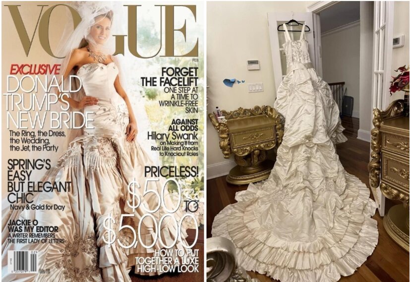Chiếc váy cưới của Đệ nhất phu nhân Mỹ đến từ nhà mốt Christian Dior, do John Galliano thiết kế riêng cho hôn lễ của bà và Tổng thống Donald Trump ở Palm Beach, Florida, Mỹ, vào tháng 1/2005. Bà Melania cũng mặc chiếc váy cùng tấm mạng che mặt dài gần 5m khi trở thành gương mặt trang bìa cho ấn bản tháng 2/2005 của tạp chí Vogue.