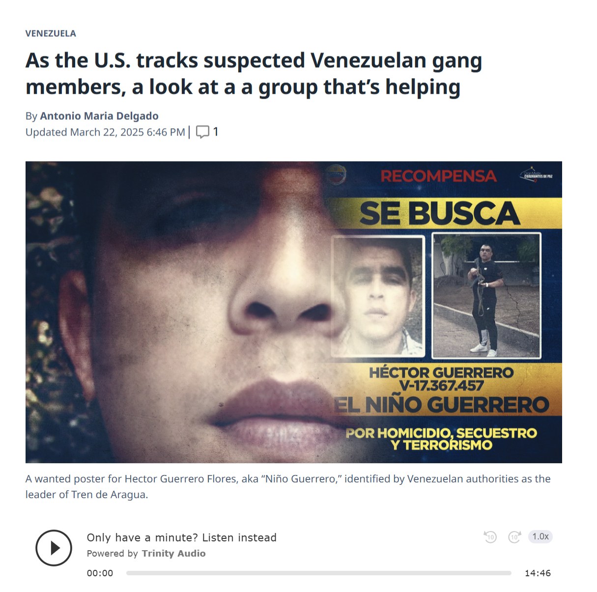 Cựu nhân viên CIA Gary Berntsen, một trong những nhân viên CIA có thành tích ưu tú nhất, khẳng định băng đảng Tren de Aragua không đơn thuần là một tổ chức tội phạm, mà là tay sai của chế độ Maduro, được cử qua Mỹ nhằm mục đích phá hoại và đầu độc người dân Mỹ. Nhà báo Antonio Delgado của tờ Miami Herald dẫn lời ông Berntsen cho biết người của Maduro, với sự trợ giúp của tình báo Cuba, đã tổ chức huấn luyện cho ít nhất 300 tên [thành viên Tren de Aragua]. Chúng được huấn luyện bắn súng, phá hoại, và nhiều hoạt động khác theo kiểu dân quân. Sau khóa huấn luyện 4-6 tuần chúng được đưa vào nước Mỹ hoạt động tại 20 tiểu bang khác nhau.