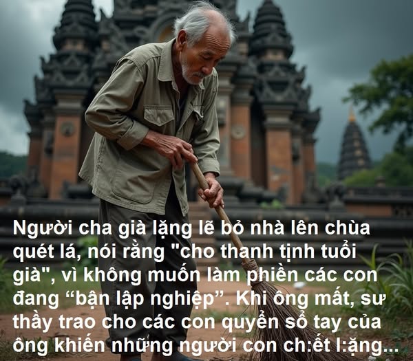 Người cha già lặng lẽ bỏ nhà lên chùa quét lá, nói rằng "cho thanh tịnh tuổi già", vì không muốn làm phiền các con đang “bận lập nghiệp”. Khi ông mất, sư thầy trao cho các con quyển sổ tay của ông khiến những người con chết lặng...