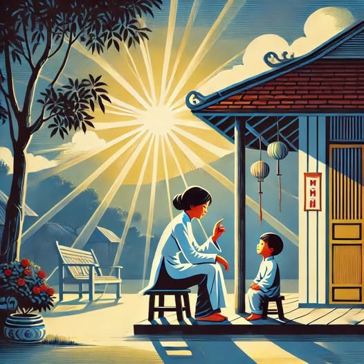 Mẹ nhìn cậu một lúc lâu, rồi nhẹ nhàng dắt Minh ra ngồi trước hiên nhà.