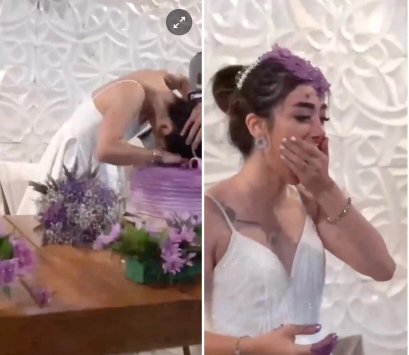 Cô dâu bất ngờ và bàng hoàng khi bị đập đầu vào bánh kem. Ảnh: X.