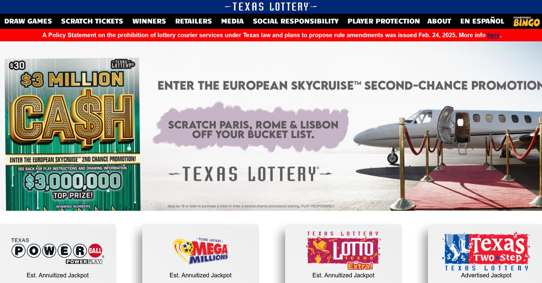 Trang nhà Ủy ban Xổ Số Texas trên màn hình chụp hôm 23/4/2025. (Ảnh: Texas Lottery)