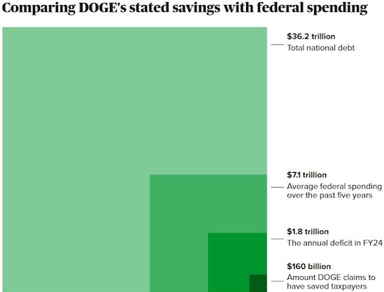 Even the $160 billion advertised as saved so far by DOGE would be tiny in the context of the larger federal budget and national debt.