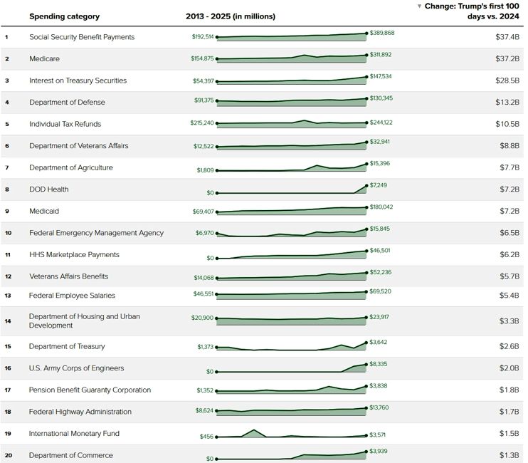 Take a look at some of the areas representing the largest spending and largest increases in Mr. Trump's first 100 days compared to the same time period in prior years.