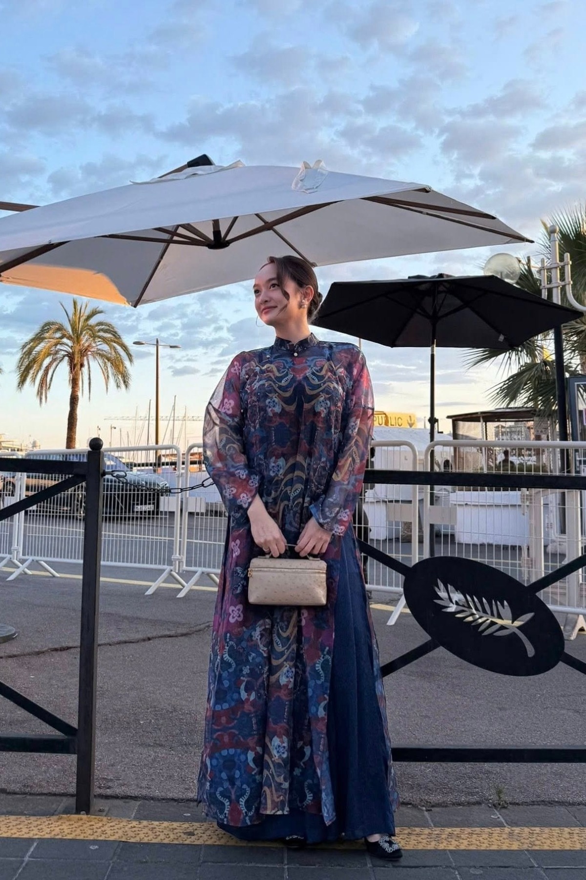 Cùng đi với Thu Anh là Kaity Nguyễn. Cô mang theo nhiều bộ áo dài để tranh thủ quảng bá văn hóa vẻ đẹp truyền thống. Diễn viên phối đồ với túi da đà điểu Extra Pocket L19 Ostrich Leather của nhà mốt Italy Loro Piana gần 180 triệu đồng.