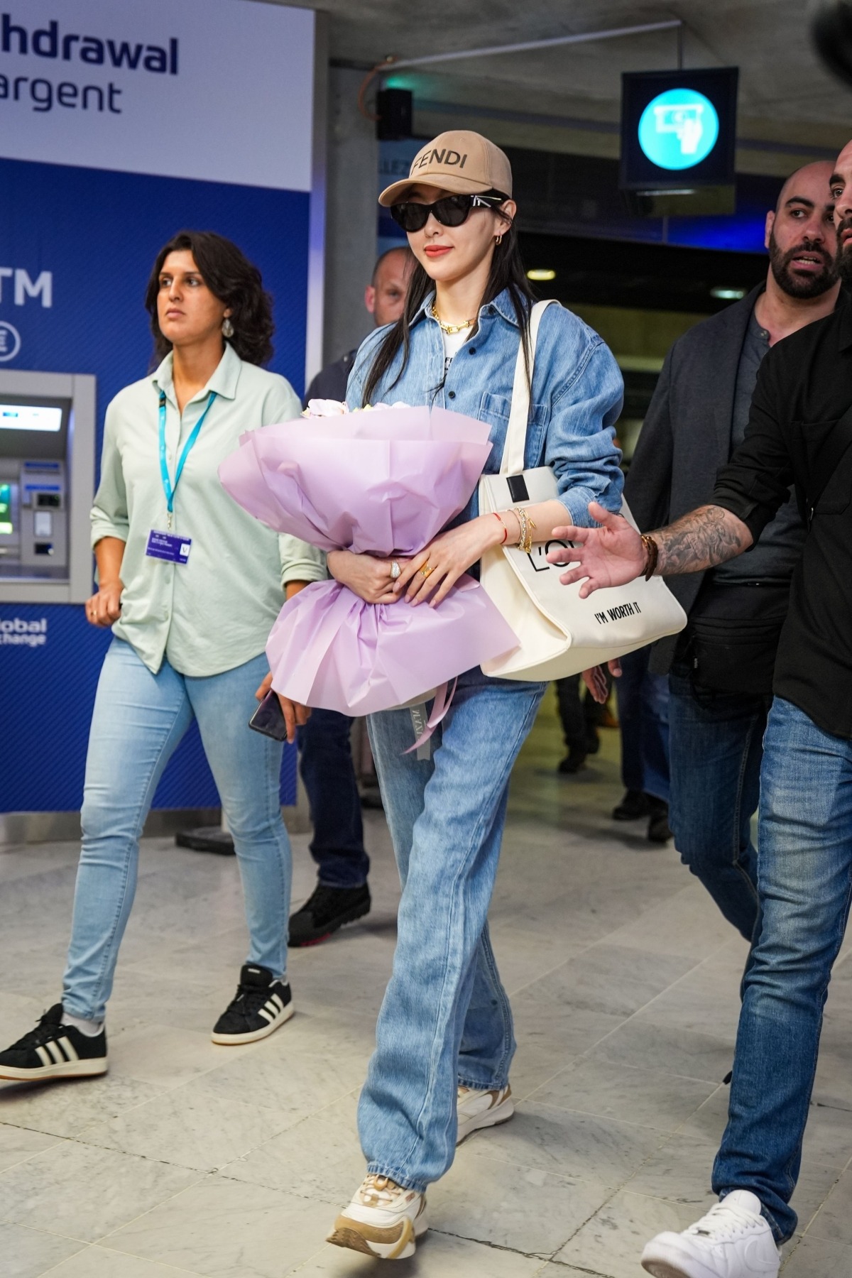 Diễn viên Trung Quốc Đường Yên chọn cả "cây" denim với mũ lưỡi trai Fendi.