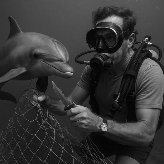 Bất chợt, ông cảm thấy một cái chạm nhẹ sau lưng. Khi quay người lại, ông thấy một con cá heo. Nhưng nó không đến để chơi đùa – ánh mắt nó như đang cầu xin một điều gì đó.