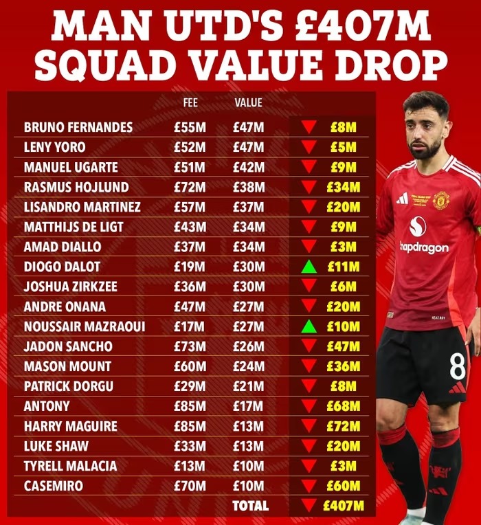 Tổng cộng, chỉ riêng 20 cầu thủ trong đội hình chính của MU bị giảm giá 407 triệu bảng. Con số nmay2 phản ánh trực tiếp phong độ tệ hại của đội bóng thành Manchester trong suốt mùa giải vừa qua.