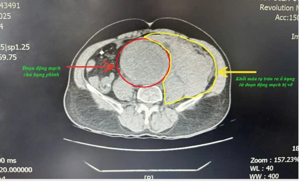 Tại bệnh viện, ông Khiêm có biểu hiện đau bụng dữ dội, da xanh nhợt, mạch không bắt được, huyết áp không đo được. Kết quả chụp CT.Scanner phát hiện phình động mạch chủ ngực đoạn dưới thận lan đến động mạch chậu 2 bên, khối phình đã vỡ gây tụ máu sau phúc mạc số lượng lớn.